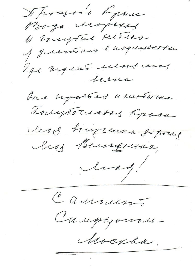 1 сентября дед с бабушкой вернулись в Москву. Завершилась их последняя совместная поездка на Черное море. В самолете Семен Кузьмич сочинил стих, рукопись которого сохранилась. Он уже очень соскучился обо мне — своей внучке Велуське и в ожидании нашей скорой встречи сложил такие строчки: